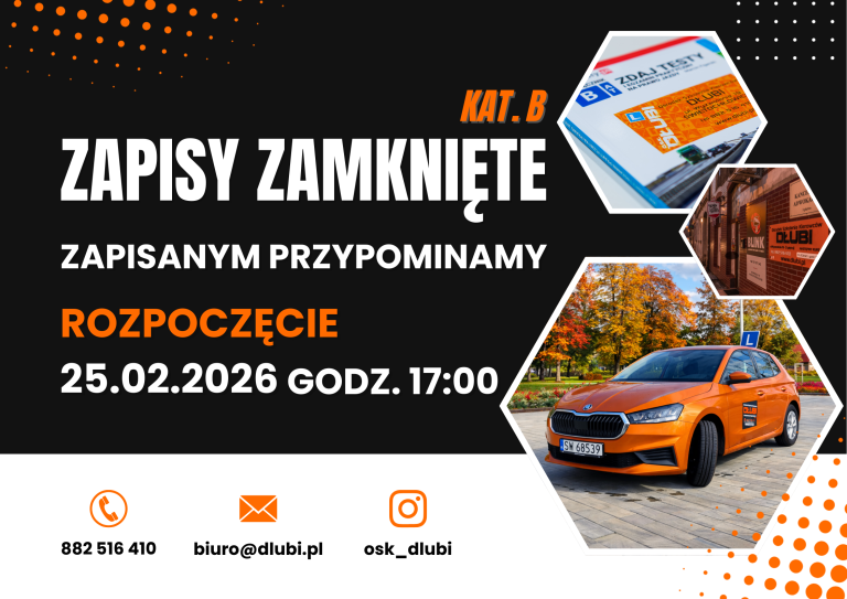 Szanowni Państwo! Zakończyliśmy nabór na kolejny kurs prawa jazdy kat. B. Zapisanym przypominamy, że rozpoczniemy